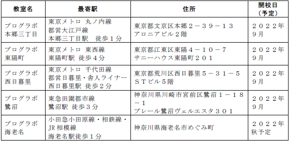今回新たに開校する「プログラボ 本郷三丁目」、「プログラボ 東陽町」、「プログラボ 西日暮里」、「プログラボ 鷺沼」、「プログラボ 海老名」の詳細は別紙のとおりです。
