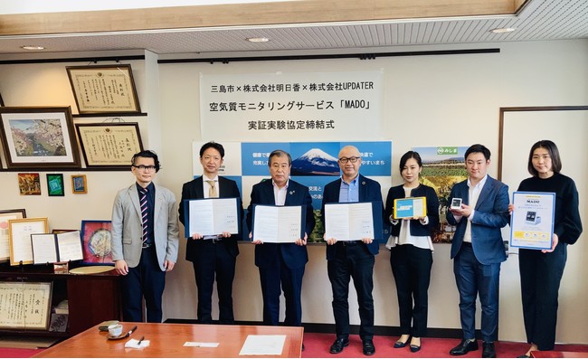 「顔の見えるライフスタイル」の実現を目指す株式会社UPDATER(所在地:東京都世田谷区、代表取締役:大石英司)のエアテック事業「みんなエアー」(https://minnaair.com/)は、静岡県三島市及び、株式会社明日香(所在地:東京都文京区、代表取締役:萩野 吉俗、以下 明日香)と共同で、三島市における保育施設等の空気質モニタリングによる、安心快適な室内環境の確保を図る目的として、2022年6月9日に「実証実験協定」を締結いたしましたので、お知らせいたします。