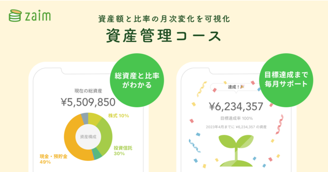 くふうグループにおいて、1,000 万ダウンロードを超える個人向け家計簿サービス「Zaim」を運営する株式会社 Zaim(本社:東京都港区・代表取締役:閑歳 孝子)は、2022 年 6 月 20 日、個人資産を定期的に確認し計画的に資産運用を行うための「資産管理コース」を公開しました。これは家計改善を支援する機能として有料会員向けに提供している、最適な家計管理のための「目的別コース」の機能拡充で、「貯金体質コース」に続く第二弾の提供となります。