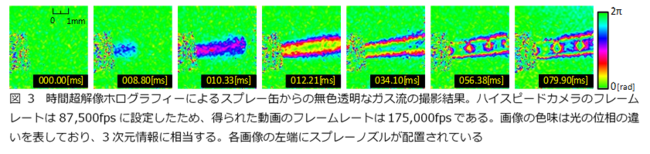 次に、ハイスピードカメラのフレームレートを87,500fpsに設定し、スプレー缶からの無色透明なガス流を時間超解像ホログラフィーで撮影しました(図3)。人間の目や普通のカメラでは透明なものを見ることはできませんが、光の位相を記録できるホログラフィーを利用すると可視化できます。ガスがスプレーノズルから噴射された後、時間の経過とともに徐々に噴射量が増大していく様子が観察できました。噴射開始から約50ミリ秒(0.05秒)が経過すると、ガス流の内部に渦状の特徴的な分布が生じている興味深い様子を捉えることもできました。