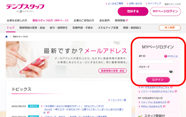 「スタッフMYページ」ログインはこちら( https://www.tempstaff.co.jp/staff/ )から