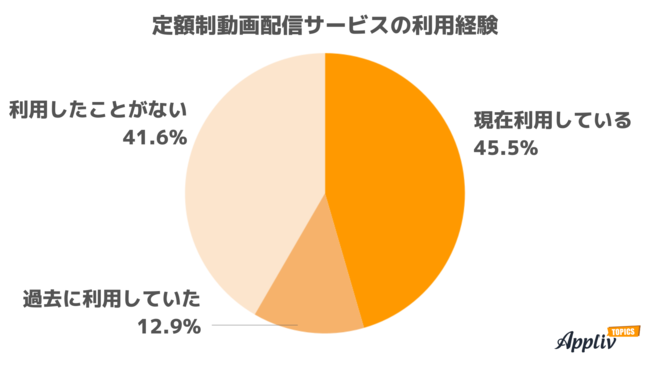 定額制動画配信サービスの利用経験の有無について質問したところ、「現在利用している」が45.5%、「過去に利用していた」が12.9%。過半数が利用経験ありでした。