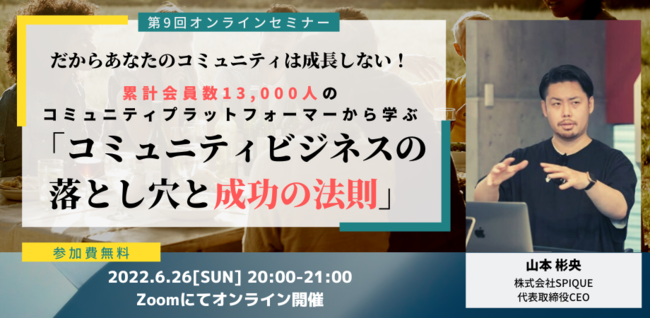 人のつながりを価値に変える株式会社SPIQUE(株式会社スパイク本社:福岡県中央区、代表取締役社長:山本彬央、以下 SPIQUE)は、6月26日(日)20時より「だからあなたのコミュニティは成長しない! 累計会員数13,000人のコミュニティプラットフォーマーから学ぶ コミュニティビジネスの落とし穴と成功の法則」と題し、新たな手法として注目されているコミュニティマーケティングやファンマーケティングを基礎から学べるオンラインセミナーを無料開催いたします。