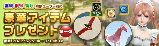 第一弾では本日から2022年7月13日(水)定期メンテナンス前までの期間で、プレイヤーの皆様のプレイ状況に合わせた3種のプレゼント内容で実施いたします。
