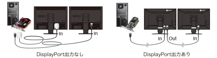 MX243Wは、DisplayPort出力端子を搭載しています。これにより、複数のモニターを使用する際に、それぞれをPCに接続するのではなく、MX243WのみをPCに接続し、2台目のモニターはMX243Wと数珠つなぎ(デイジーチェーン)で接続することができ、配線がシンプルになります。