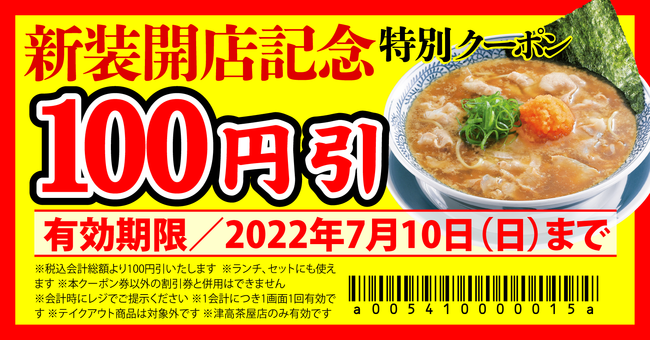 オープン記念として、2022年7月10日(日)まで『丸源ラーメン 津高茶屋店』のみでご利用いただける100円引クーポンを配布します。