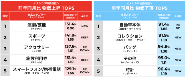 <メルカリ物価・数量指数からわかる5月トレンド通信>「リベンジ消費」の拡大でコロナ前の水準に消費が回復。「演劇/芸能(チケット)」が物価上昇1位となり、前年同月比約1.5倍増