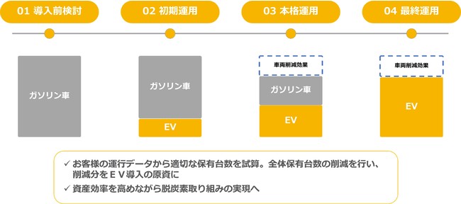 本サービスは、はじめてのEV導入から3つの支援を繰り返し運用することでお客様の業務車両のEV化を加速させるサービスです。お客様のEV導入状況に合わせ最適な支援を行い、車両の台数削減やEVの有効活用をしながら無理なくEV化を進めます。