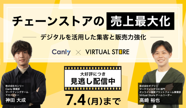 Googleビジネスプロフィール(旧・Googleマイビジネス)・HP・各SNSの一括管理サービス「Canly(カンリー)」の開発・提供を行う株式会社カンリー(所在地:東京都渋谷区、代表取締役:辰巳 衛,秋山 祐太朗)は、2022年5月24日(火)に開催した株式会社ギブリーとの共催ウェビナー『チェーンストアの売上最大化~デジタルを活用した集客と販売力強化~』を1週間限定で無料配信することとなりましたのでご案内いたします。