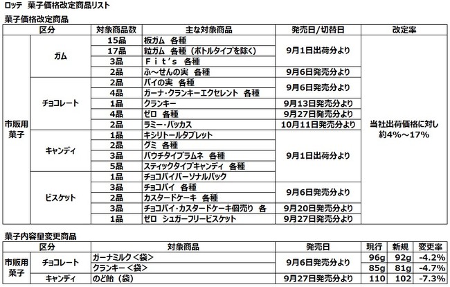 株式会社ロッテ(代表取締役社長執行役員:牛膓栄一)は、菓子商品の価格改定および内容量変更を実施いたしますのでお知らせします。