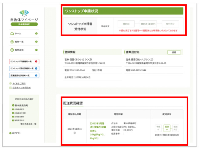 今回のアップデートで、「ワンストップ申請書受付状況確認」と「返礼品の配送状況確認」の機能を搭載。寄附ごとに受付や配送状況が「見える化」されます。寄附者から自治体への問合せ回数を削減し、寄附者の利便性向上と共に、自治体におけるふるさと納税業務の効率化を実現します。