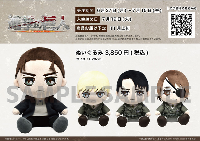 TVアニメ『進撃の巨人』から新作グッズが登場!エレン、アルミン、リヴァイ、ハンジがペタンとおすわりしたぬいぐるみに