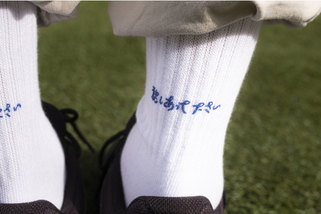 恋人やパートナーとのお悩みを寄せてくれたリスナーにプレゼントしている「話しあってください」ステッカーがソックスに。直接言葉で伝えられない気持ちを、靴下をチラ見せさせて相手に伝えよう!