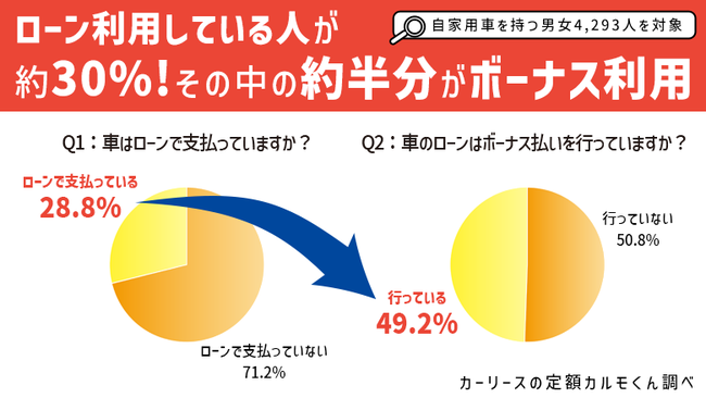 夏のボーナス支給シーズンが到来。夢の車を購入したり、旅行に行ったりとボーナスの使い方もさまざまあるかと思いますが、車のローンのボーナス払いにあてている人はどのくらいいるのでしょうか。定額カルモくんでは、自家用車をお持ちの男女4,293人にボーナス払いで車を購入しているか、また実際に購入した方がなぜそうしたかなどを調査しましたので、ご紹介します。