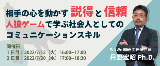 そこで今回は、『人狼ゲームで学ぶコミュニケーションの心理学-嘘と説得、コミュニケーショントレーニング』の著者、WizWe総研 主任研究員 丹野宏昭Ph.D.より、人狼から学ぶコミュニケーションスキルやプレゼンテーションの高め方をご紹介するセミナー。そして、丹野のファシリテーションで実際に人狼を体験いただく参加型セミナーを2回に分けて実施いたします。