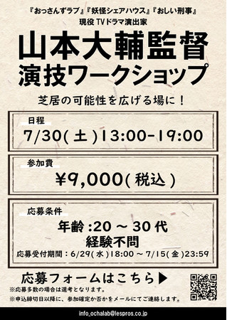 『おっさんずラブ』『おしい刑事』『妖怪シェアハウス』等の人気コメディ作品を多数演出!山本大輔監督による役者の新たな一面を引き出すワークショップを開催!