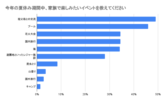 他の回答には、「プール(45.9%)」、「花火大会(37%)」、「国内旅行(34.5%)」がランクインする結果となり、子育て世代の外出意欲は高い傾向にあると捉えます。
