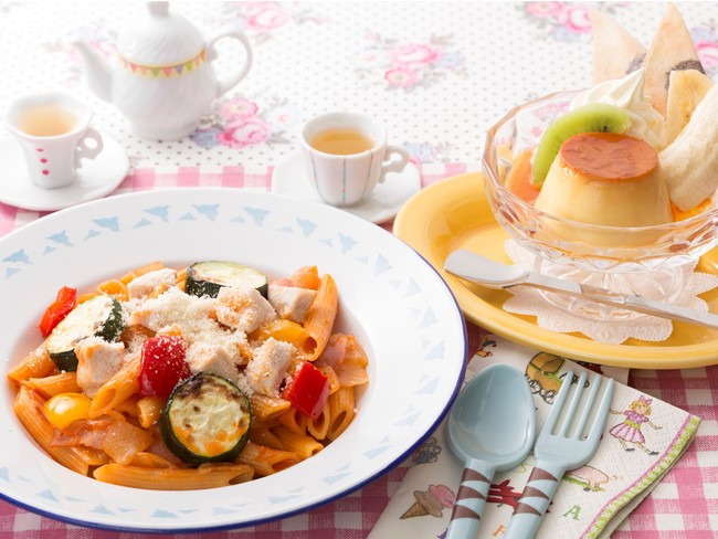 トマトパスタはしっとりと蒸し上げた鶏肉と、旨味と甘みが凝縮したグリル野菜を添えて栄養満点!