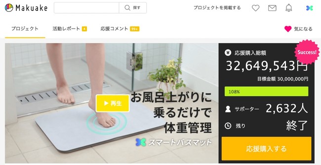 スマートバスマット、応援購入サイトMakuakeで3268万円のご支援金と共に無事終了いたしました。