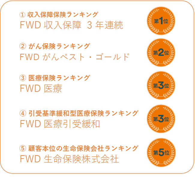 2022年1月4日に発表されたオリコン顧客満足度(R)調査において、収入保障型生命保険商品ランキングで『FWD収入保障』が1位、また生命保険ランキングで当社が生命保険会社として3位に選ばれました。FWD生命に関してより詳しく知りたい方は、https://www.fwdlife.co.jpをご覧ください。