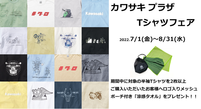 株式会社カワサキモータースジャパン(本社:兵庫県明石市、代表取締役社長:桐野 英子)が展開するカワサキ プラザネットワークでは、7月1日(金)から8月31日(水)までの期間中、カワサキプラザアパレルの半袖Tシャツ2枚以上をご購入いただいた方に、ロゴ入りメッシュポーチ付き「涼感タオル」をプレゼントする"カワサキプラザTシャツフェア"を開催します。