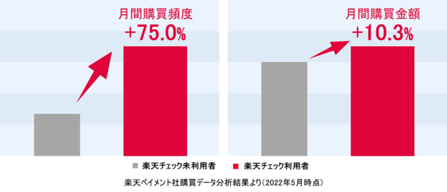 ほっかほっか亭では、2020年に「楽天ポイントカード」を、2021年11月に「楽天チェック」を導入しています。「楽天チェック」を導入後、「楽天ポイントカード」単体利用者よりも、「楽天チェック」と「楽天ポイントカード」の併用利用者は月間購買頻度が75%向上、月間購買金額も10%向上する効果がみられています。これらの導入効果を踏まえ、導入企業に来店される顧客の定着化や売上の向上を目指します。(楽天ペイメント社購買分析データによる。2022年5月時点)