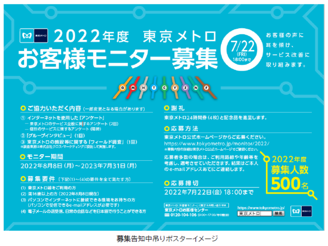 東京地下鉄株式会社(本社:東京都台東区、代表取締役社長:山村 明義、以下「東京メトロ」)では、お客様の声に耳を傾け、サービス改善に取り組むことを目的に、『2022年度 東京メトロお客様モニター』を500名募集いたします。