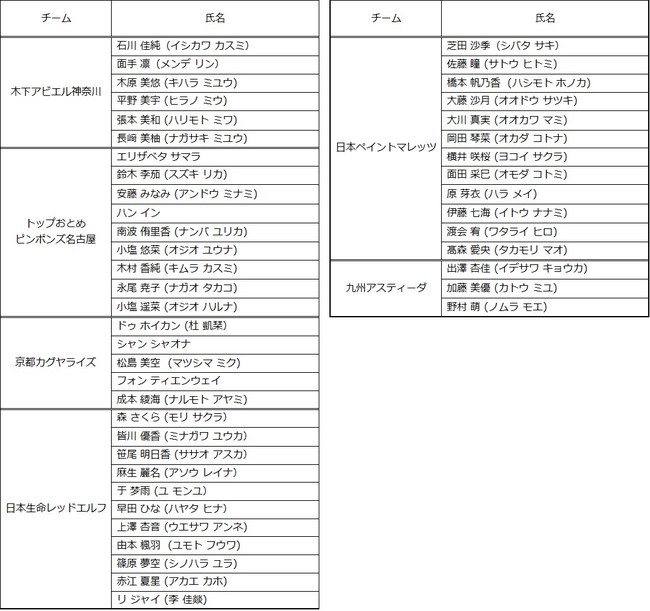 卓球のTリーグ 2022-2023シーズン 登録完了選手(2022年6月30日付)
