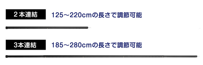 本製品は、1本のポールが3節の連結可能なジョイントパーツに分かれており、そのパーツの上下の節に入れ子となった伸縮パーツで構成されています。