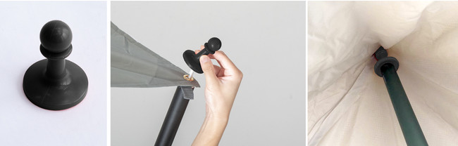 本製品には、タープの先端に取り付けることで、タープが風にあおられてもガイロープやグロメットがポールから抜けにくくする抜け防止の先端キャップを標準装備しています。
