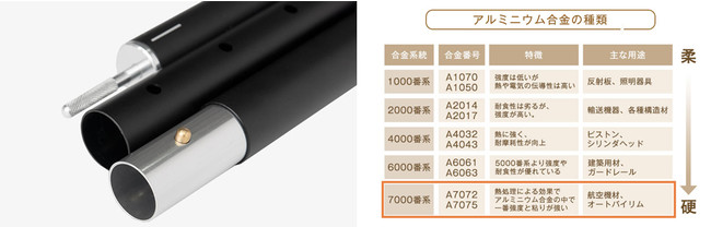 ポールの素材となるアルミニウム合金は、アルミニウムの中で最も強度のある7000番台を使用し、その中でも最も硬いと言われるA7075番を使用しています。このA7075番は「超々ジュラルミン」と一般的に呼ばれており、亜鉛(Zn)とマグネシウム(Mg)を成分に含むアルミニウム合金です。