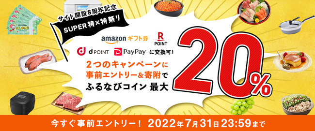 株式会社アイモバイル(本社:東京都渋谷区、代表取締役社長:野口哲也、東証プライム市場)が運営するふるさと納税サイト「ふるなび」( https://furunavi.jp/ )が『最大20%!サイト開設8周年記念 SUPER特×特祭り 事前エントリー&寄附でふるなびコインがもらえる!』を2022年7月4日(月)12:00より開始しました。