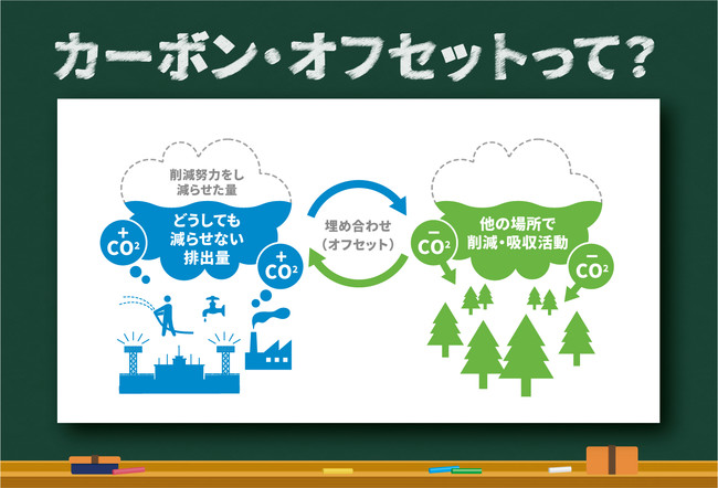 日常生活や経済活動などにおいて避けることができないCO2等の温室効果ガス(カーボン)の排出について、できるだけ排出量が減るよう削減努力を行ったうえで、どうしても排出される温室効果ガスについて、排出量に見合った温室効果ガスの削減活動に投資すること等により、排出される温室効果ガスを埋め合わせる(オフセット)という考え方です。