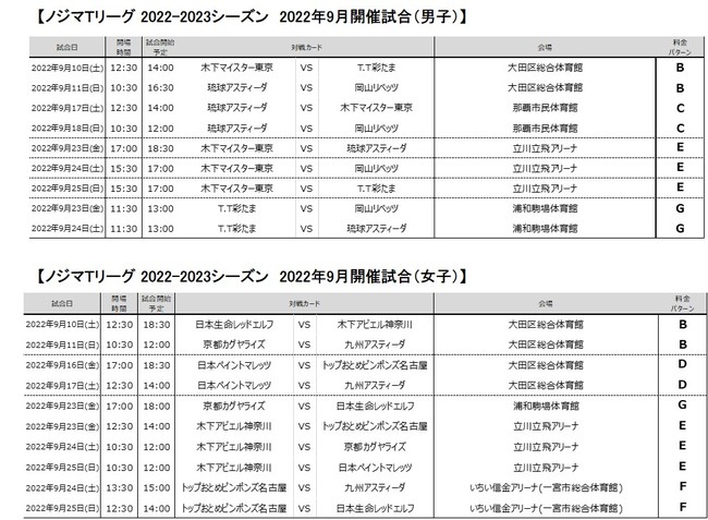 ノジマTリーグ 2022-2023シーズン 2022年9月開催試合 チケット販売のお知らせ