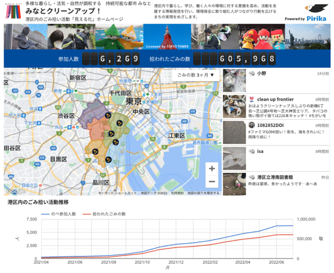 これらのデータを活用して、自治体の清掃・地域美化活動を促進するべく、現在、自治体ごとに切り出してウェブ上で視覚的に表示する「ピリカ自治体版 見える化ページ」の導入が広がっています。清掃活動に参加する企業・団体一覧、ごみ拾いの実績をランキングやマップで見ることができ、データによって必要な清掃箇所の洗い出し等にも活用されています。