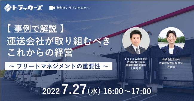 トラック保有企業のための業務効率化プラットフォーム「トラッカーズ」(https://market.trck.jp/)を運営する株式会社Azoop(アズープ、本社:東京都港区、代表取締役:朴 貴頌、以下:Azoop)は7月27日(水)に、トランコム株式会社の取締役専務執行役員 事業戦略本部担当 上林亮 氏をお迎えし「事例で解説:運送会社が取り組むべき、これからの経営~フリートマネジメントの重要性~」を開催することをお知らせいたします。