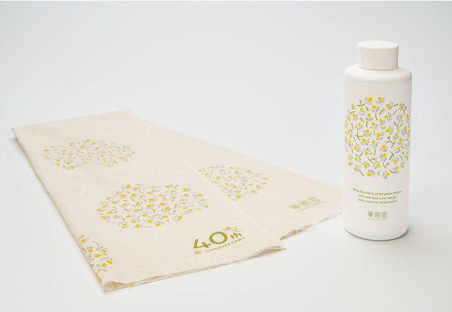 皆さまへの感謝をあふれんばかりのカモミールで表現したモチーフを全体にちりばめた華やかなデザイン。 40周年を記念したアニバーサリーロゴもあしらいました。