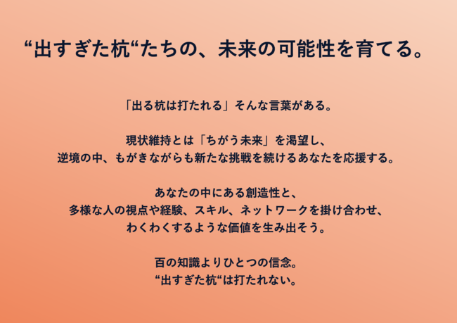 “富山県では、令和4年2月に策定した富山県成長戦略において、スタートアップ支援を施策の柱に掲げ、スタートアップエコシステムの構築に向けたロールモデルを創出するため、突き抜けた起業家に対する集中的な支援を行います。ぜひ、富山県で、共に、ワクワクする新しい未来を作っていきましょう”