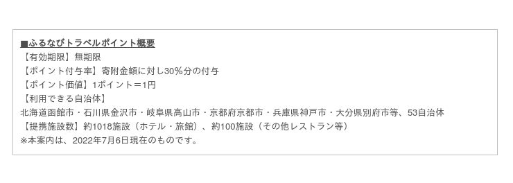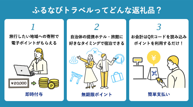 ふるさと納税先にある提携ホテル・旅館で利用可能な、無期限の電子ポイント(トラベルポイント)が返礼品として付与される、初めての方にも判りやすいふるさと納税サービスです。