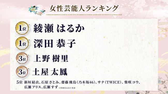 2000年のデビュー以来、数々のテレビドラマ、映画、CM作品に出演する女優の綾瀬はるかさんがランクイン。過去オリコン調査の「恋人にしたい女性有名人ランキン」で5度1位に輝くなど、その美貌と実力でファンを魅了しています。