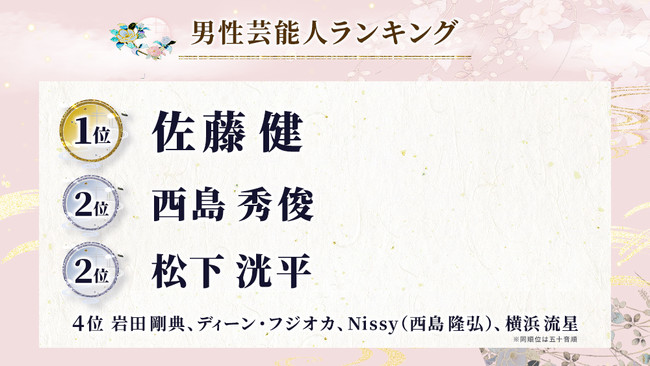 俳優、タレント、シンガーソングライターとして活動する松下洸平さんが西島さんと同率2位でランクイン。舞台やミュージカル作品への出演後、俳優としての頭角を現しテレビドラマ・映画・CMなどの映像作品でも活躍。2022年4月からのフジテレビ木曜劇場にも出演し話題となりました。