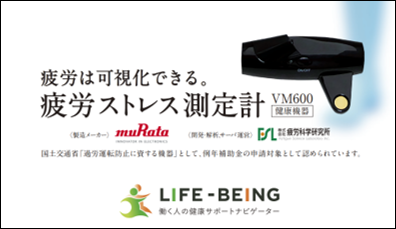 バス、タクシー、トラックなどの自動車運送事業者の交通事故防止の先進的な取組を支援するために国土交通省が実施する補助事業です。(株)疲労科学研究所が国土交通省に「過労運転防止に資する機器」としての申請を行い、令和4年6月20日、「バイタルモニターVM600(製造販売元:疲労科学研究所)」と「疲労ストレス計MF100(製造販売元:村田製作所)」が、本年度の機器に選定されました。(株)LIFE-BEINGは、両機器の販売・リース・レンタルを取り扱っております。
