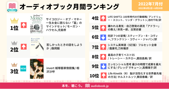 日本一のオーディオブック書籍ラインナップ数(※)を配信する「audiobook.jp」を運営する株式会社オトバンク( 本社:東京都文京区、代表取締役社長:久保田裕也、以下「オトバンク」)は、当社が運営する会員数が200万人を突破した日本最大級のオーディオブック配信サービス「audiobook.jp」におけるオーディオブック月間ランキング7月付(2022/6/1~6/30)を発表します。