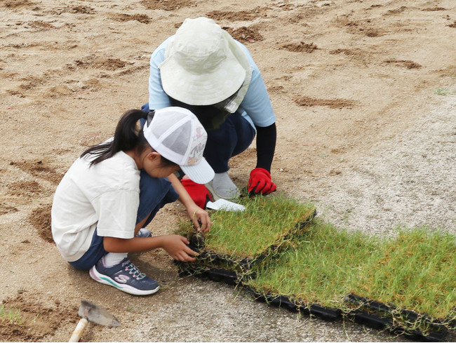 コロナ禍で、子ども達の体験の場が減少していることから、私たちに出来ることは何かと考え、工場見学の受け入れ等を実施してまいりました。今回も地域の皆さまと一緒に体験することで子ども達の“原体験”の一つになればと思い参加させていただき、私自身もとても貴重な体験をさせていただきました。数か月後には苗が育ち芝のグラウンドが出来るということで、地域の皆さまの憩いの場になることを今から心待ちにしています。