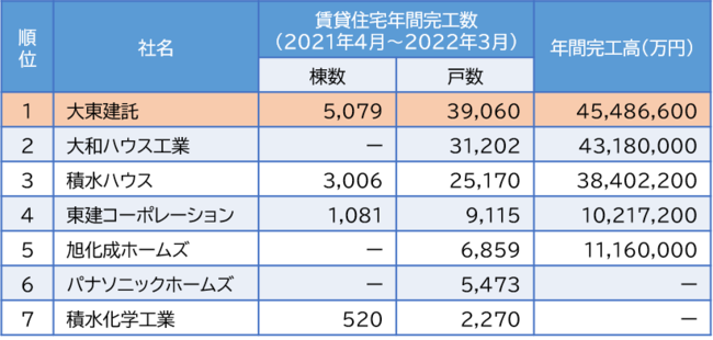本ランキングは、2021年度の賃貸住宅完成戸数について、全国賃貸住宅新聞社が全国の建築会社にアンケート調査を実施し、回答があった116社の申告をもとに作成されたものです。当社の2021年度(2021年4月~2022年3月)における賃貸住宅の完工数は5,079棟、39,060戸で、回答のあった大手ハウスメーカー7社の中で第1位となりました。