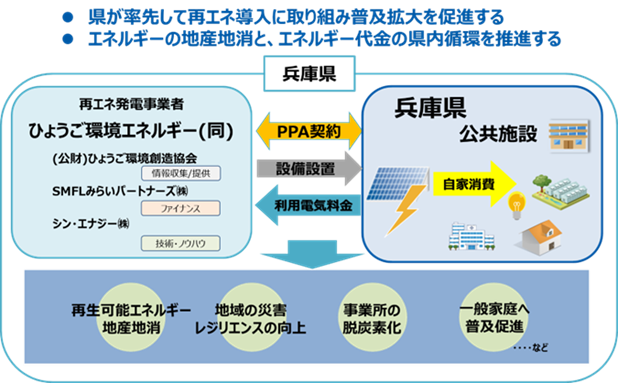ひょうご環境エネルギーは、兵庫県が率先して進める県内のカーボンニュートラルに向けた取り組みを請け負い、県内施設への太陽光発電をはじめとしたPPAモデルによる再生可能エネルギーの自家消費を行う事業を推進してまいります。