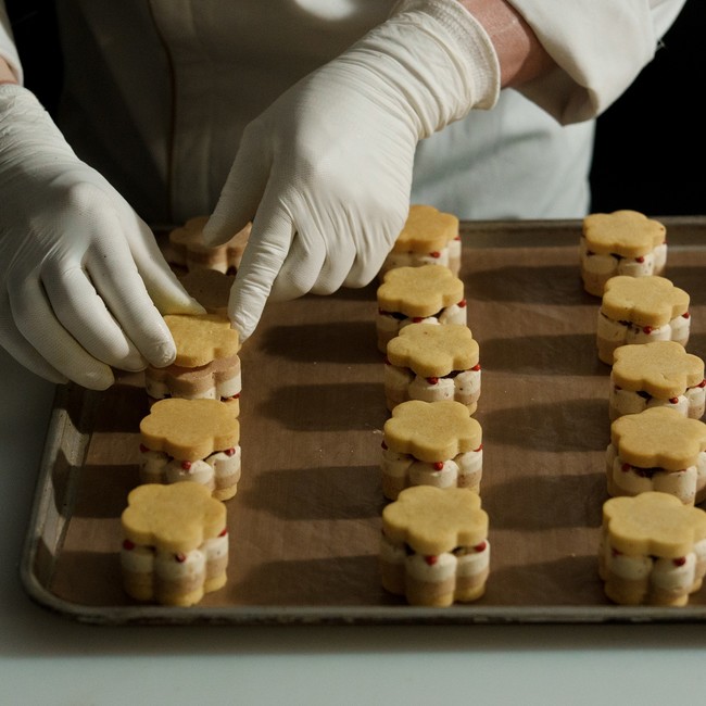 シチリア産のピスタチオとローストアーモンドを練り込んだ2層仕立てのバタークリームに、ローストしたピスタチオとカシューナッツをトッピング。ピスタチオ味のサブレでサンドしました。
