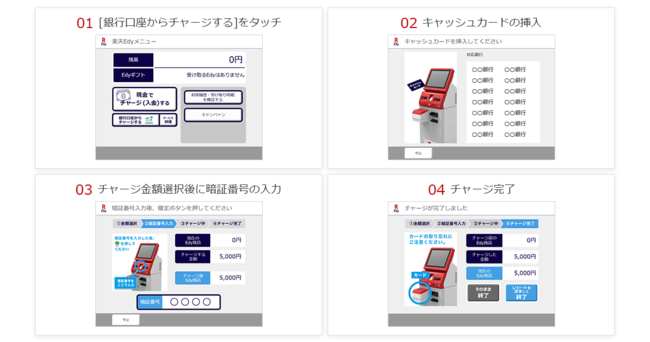・概要:利用者はキャッシュカードを多機能チャージ機に挿入し、キャッシュカードの暗証番号を入力すると、対象金融機関から直接「楽天Edy」にチャージができます。