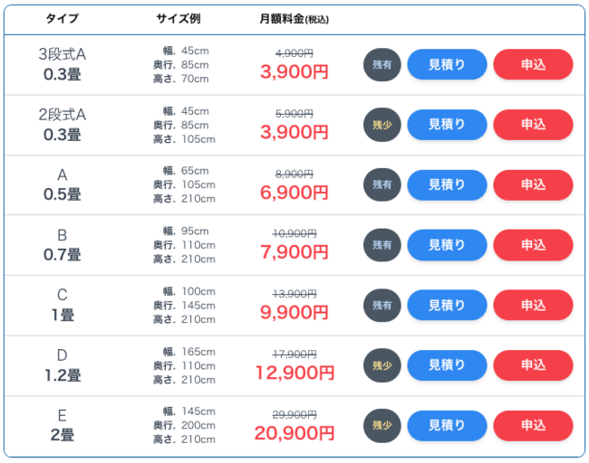部屋タイプとサイズ、月額料金はこちら