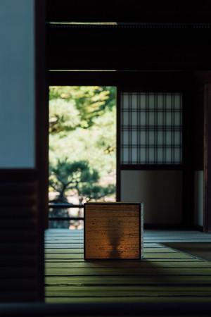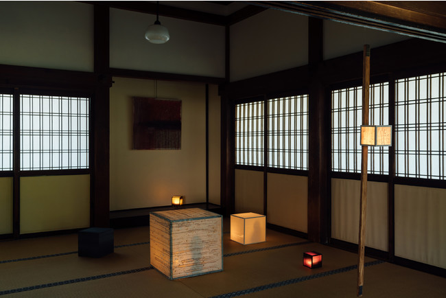 2020年の「胎内衆会『 ぼくらは何処にかえるのだろう?』」では、両足院の方丈内陣を黒い絹本で覆うインスタレーションによって、観客を、本尊・阿弥陀如来を視覚でなく気配で感得させる体験へと導きました。今展では、両足院の古材を枠に用い、山田が抽象画を描いた絹本を張った中に、仏像と灯火を包み込んだオブジェ『影向』(ようごう)* を、Antiques&Art Masaが制作。夕闇に満たされた両足院の方丈に、いくつもの「見えない浄土」が浮かび上がるかのような景色を描きます。